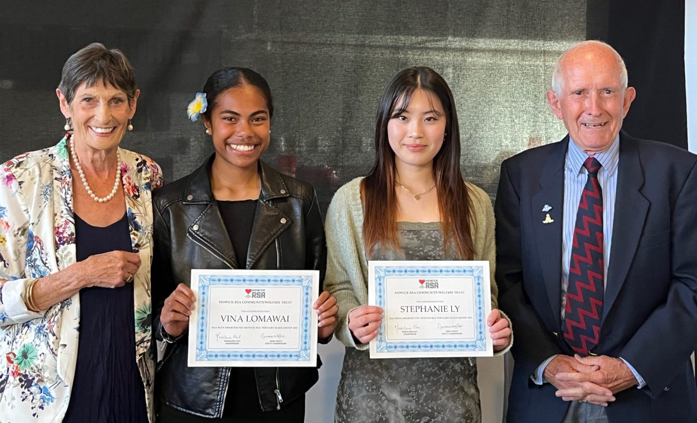 This year’s Howick RSA Tertiary Scholars are Stephanie Ly of Ormiston Senior College, and Vina Lomawai of Howick College, and they received their certificates and awards at the RSA’s hospitality venue, the Howick and Pakuranga Community Sports Centre, Bell Park.