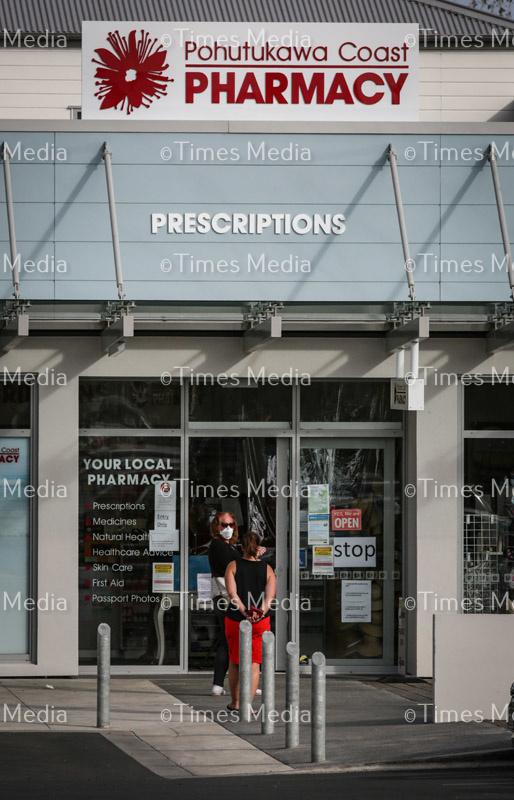 Locals wait for access to Pohutukawa Coast Pharmacy in Beachlands on the second day of Covid 19 lock down in New Zealand.
