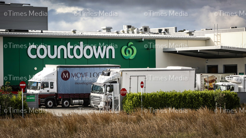 Trucks queue to offload stock to Countdown in Beachlands, Auckland, on the second day of Covid 19 lock down in New Zealand.