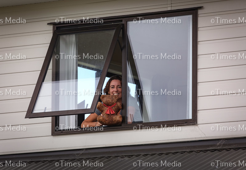 Beachlands resident Clare McGillivray, happy to be part of the Bear Hunt. Cuddly creatures are being displayed in community home windows as part of the Bear Hunt, something to put a smile on children’s faces as they are out exercising during the Covid 19 lock down in New Zealand. the Covid 19 lock down in New Zealand.