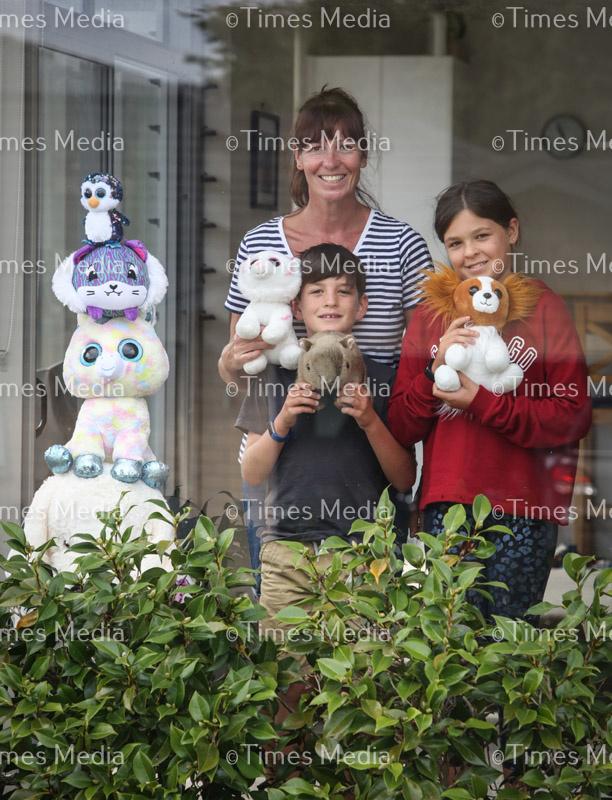 Beachlands residents Maria, James and Lottie Currell with their teddy bear display. Cuddly creatures are being displayed in community home windows as part of the Bear Hunt, something to put a smile on children’s faces as they are out exercising during the Covid 19 lock down in New Zealand.