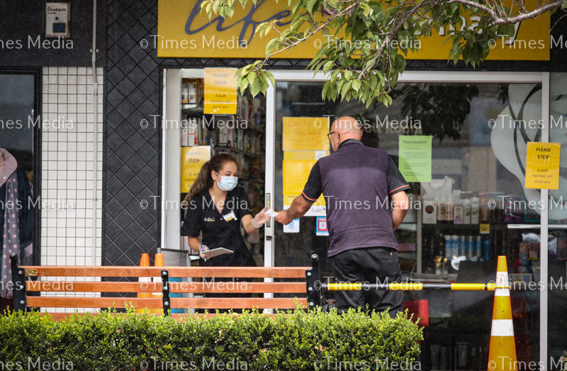 A Life Pharmacy staff member serves a local customer on the second day of Covid 19 lock down in New Zealand.